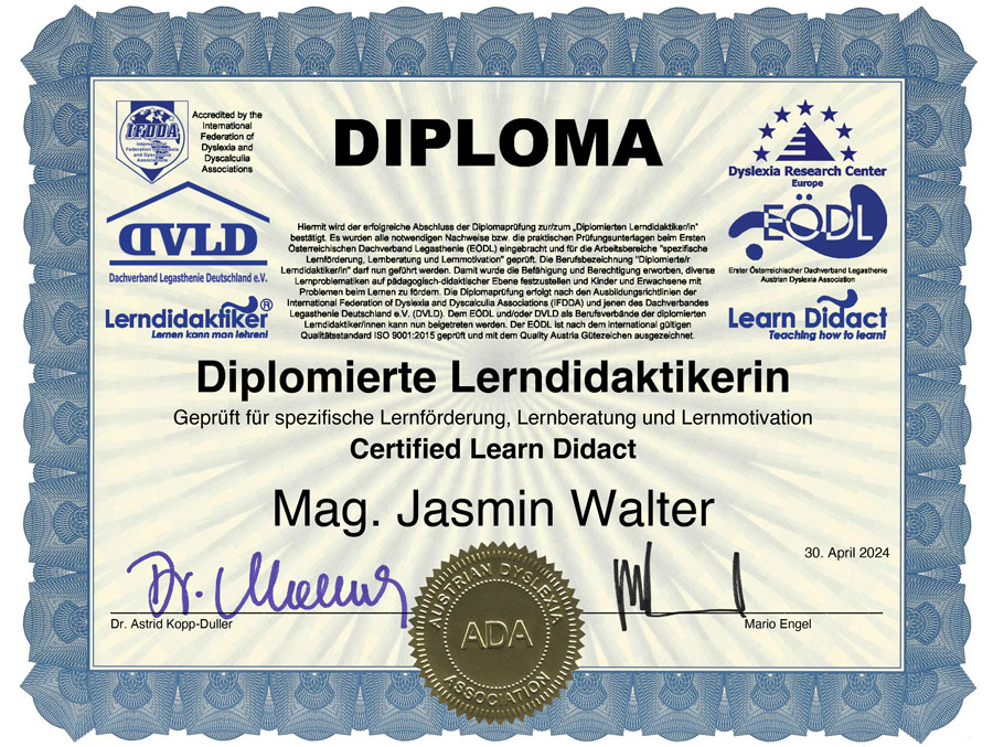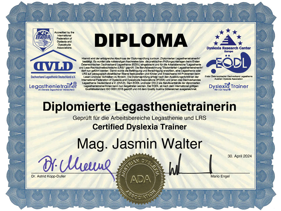 Klinische Psychologin, Gesundheitspsychologin, Legasthenietrainerin, Lerndidaktikerin